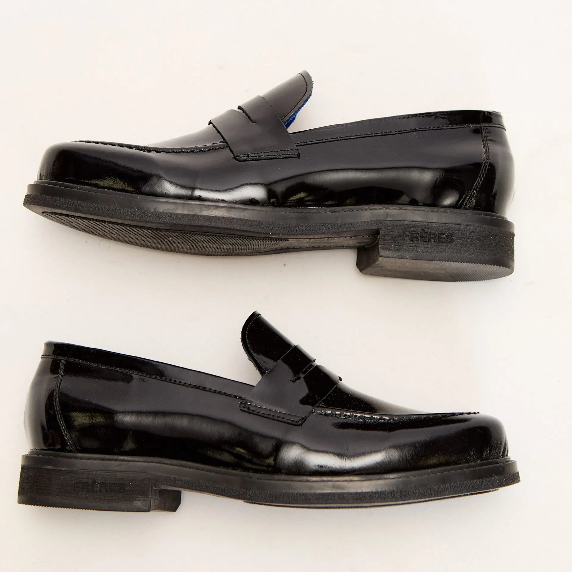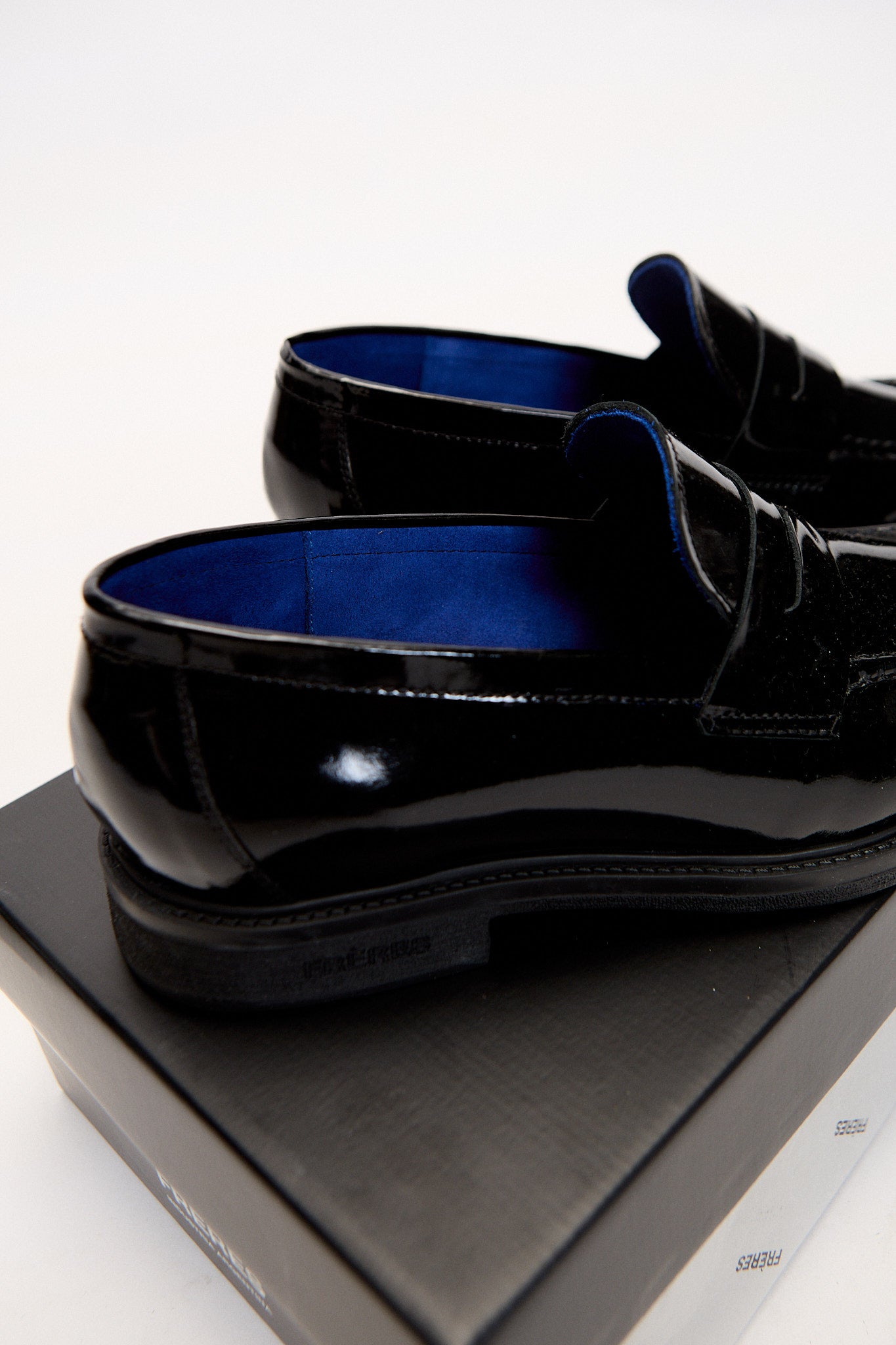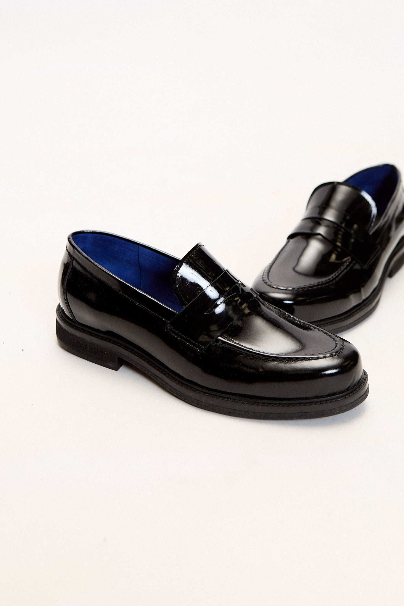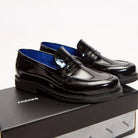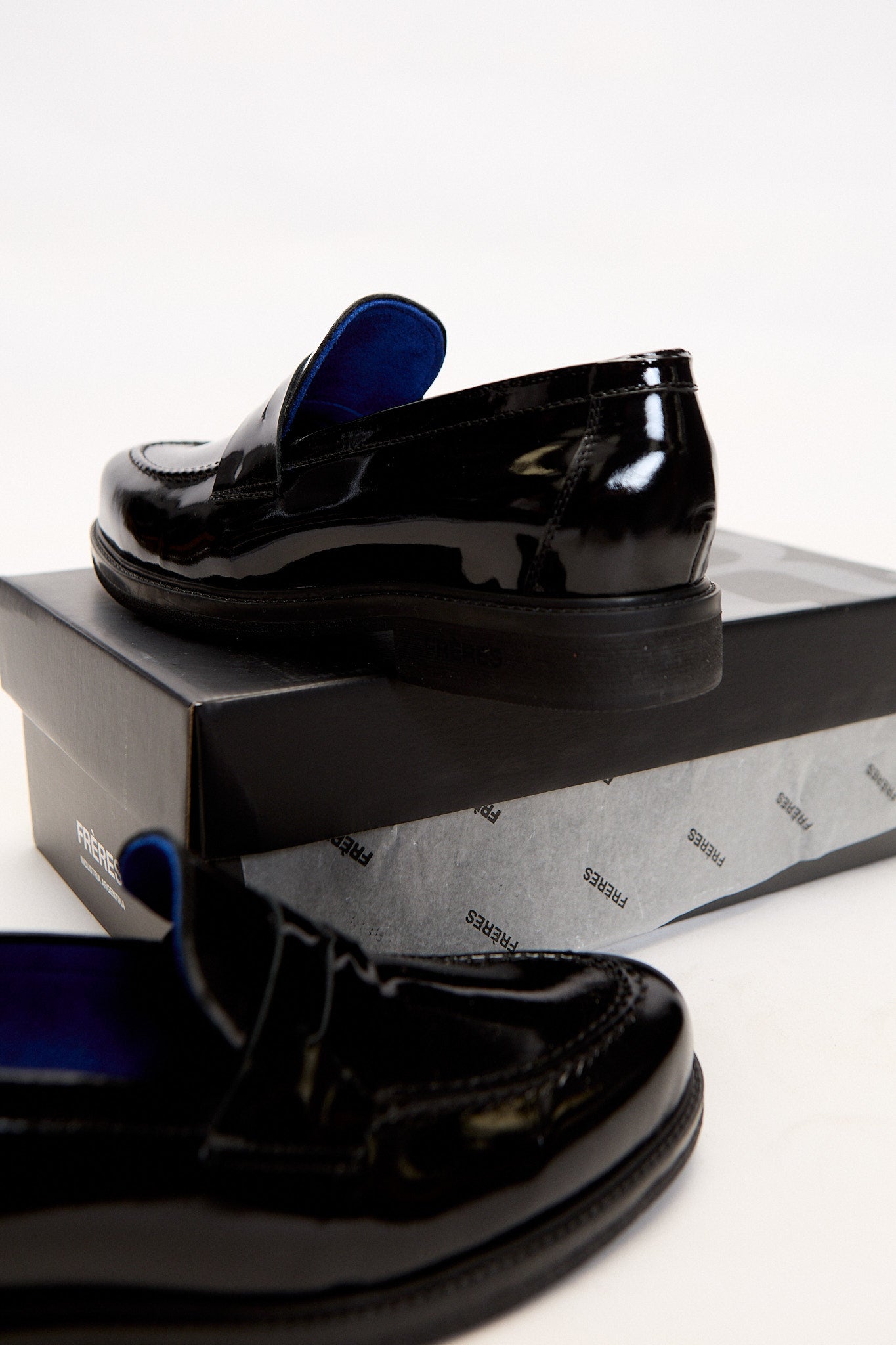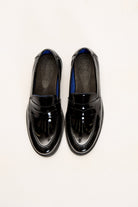 Nuestro mocasín charol noir es una de las variantes de nuestro primer calzado de silueta elegante. Confeccionado 100% en cuero vacuno. En la punta se encuentra la característica costura de mocasín acompañando la forma de la horma. Su interior tiene un color azul eléctrico, y una plantilla con nuestro logo FR grabado con metalizado.
